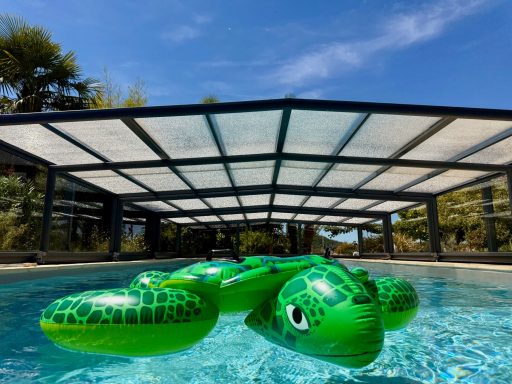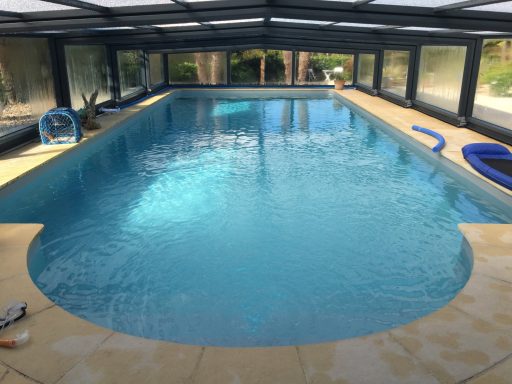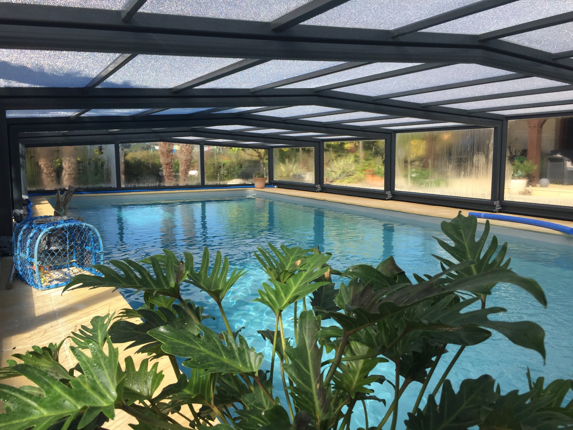 Une piscine confortable pour se relaxer quel que soit le temps qu'il fait grâce à son abri coulissant & sécurisé. Elle mesure 11m par 4,5m. En profondeur, depuis l'escalier Roman, elle est à 1m20 pour finir à 1m70. L'abri peut être fermé ou ouvert. Avec de l'eau salée pour votre confort. Chauffée de fin avril à fin septembre avec un minimum de 28°.