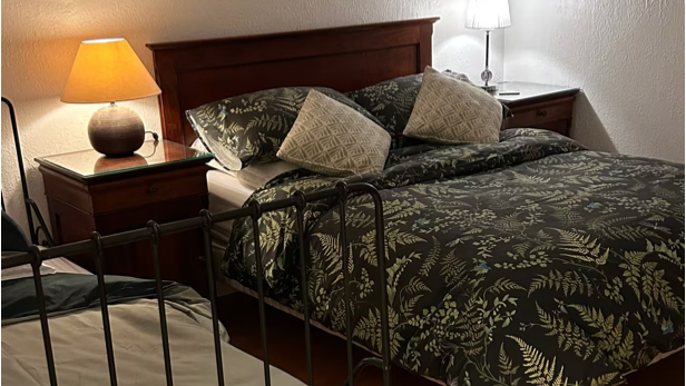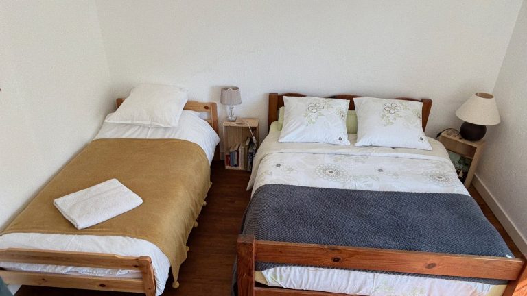 La chambre 2 possède un lit 140cm et un lit de 90cm, permettant des familles composées ou des groupes d'amis d'avoir chacun son lit. Un chevet à chaque côté avec des lampes et prises élctriques, une coiffeuse avec tiroirs et un portant avec des cintres. Les lits sont prêt pour dormir fait avec linge de qualité avec deux oreillers par personne. Les serviettes de bain ainsi que des serviettes pour la piscine sont fournies. Face à l'est la fenêtre donne sur le jardin potager.