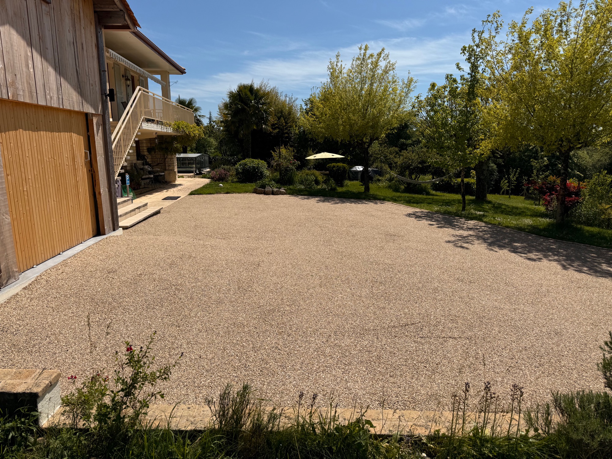 Un terrain de pétanque mais pas que...il est polyvalent et ici on joue "Cornhole".